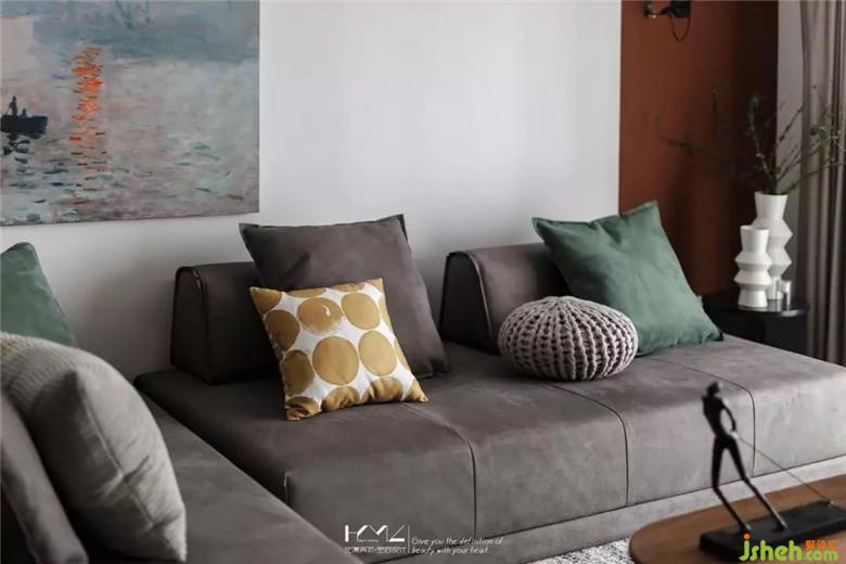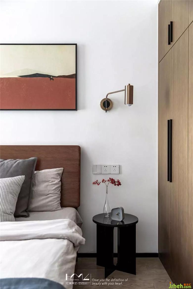 主臥與公共空間統(tǒng)一,裝修公司沿用了木飾面材料,將整個L型飄窗包裹,整體格調(diào)素雅;背景墻選擇了橙紅色裝飾畫點綴,這里也同客廳背景的色調(diào)統(tǒng)一呼應。