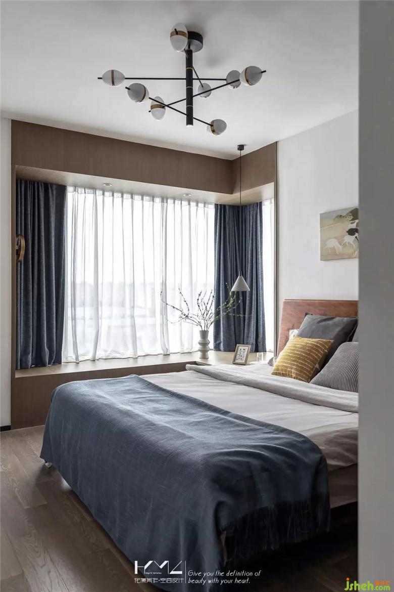 床頭一側(cè)飄窗臺面兼具床頭柜使用,吊燈與壁燈的非對稱設計,讓空間更加靈動與輕松。