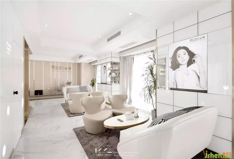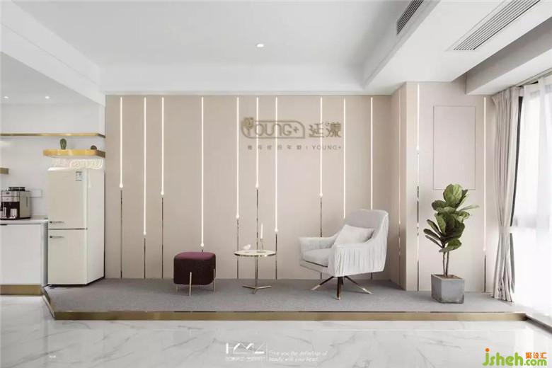 進入主接待廳,首先展現(xiàn)的是一面品牌形象墻,裝修公司運用kd板與亮面不銹鋼的和led水滴形燈柱的結合,將原本枯燥的接待過程以夢幻的氛圍呈現(xiàn)。