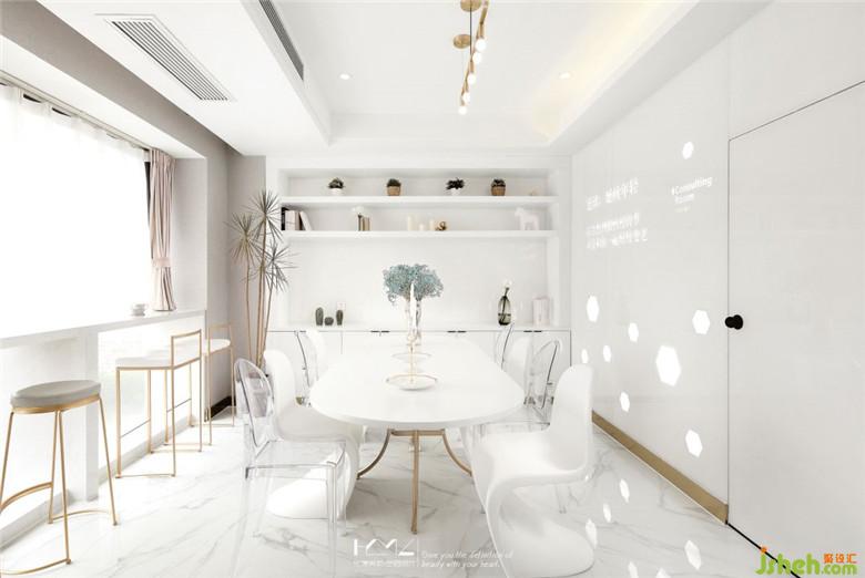 會議區(qū)與接待區(qū)合并在一起,裝修公司將室外美景利用落地玻璃窗引到室內,室內外無過渡的融合,客戶在體驗的同時,我們的技師在這里開會研討,空間的利用更加多元化,超白玻結合整體燈箱照明在這個墻面也是繼續(xù)延用,整體空間更加完整統(tǒng)一。