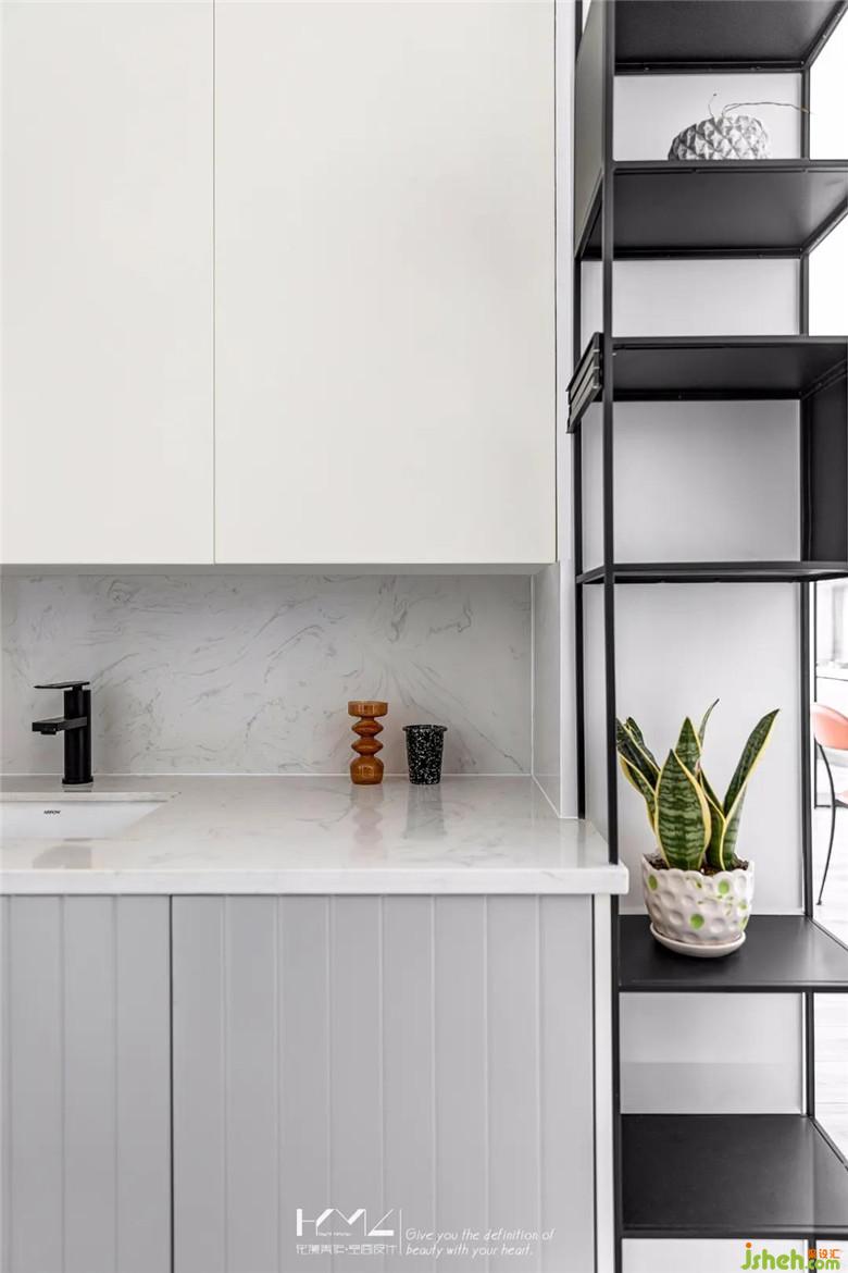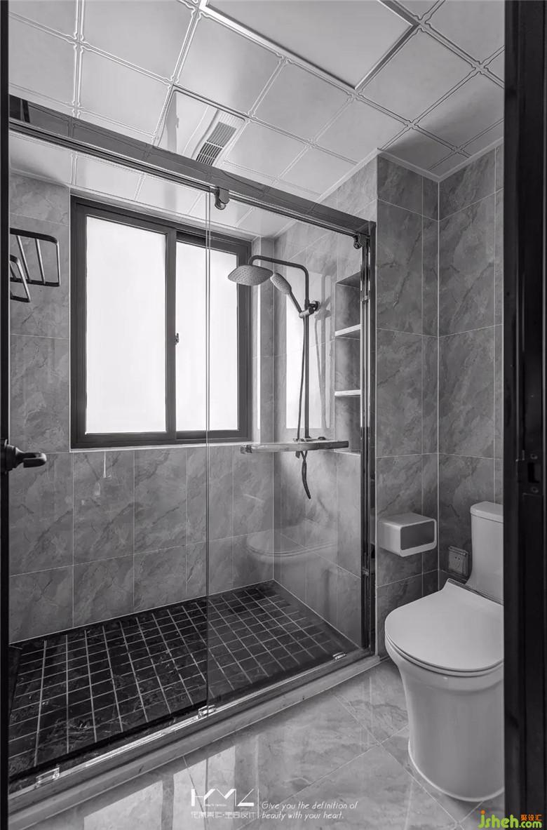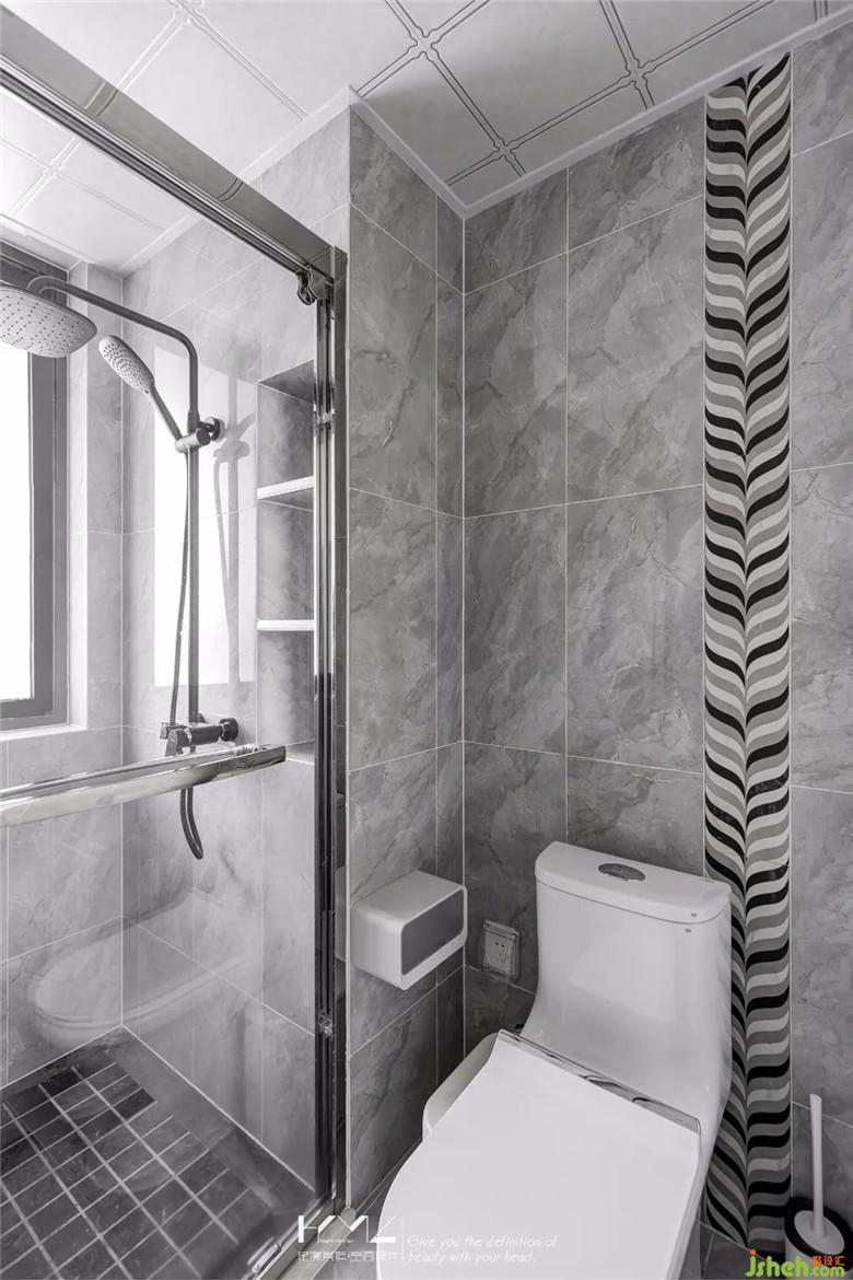衛(wèi)生間墻地磚一體通鋪,馬桶背后點綴一列藝術花磚,淋浴地面全石材抽縫,整體干凈利落,與整屋風格調性一致。