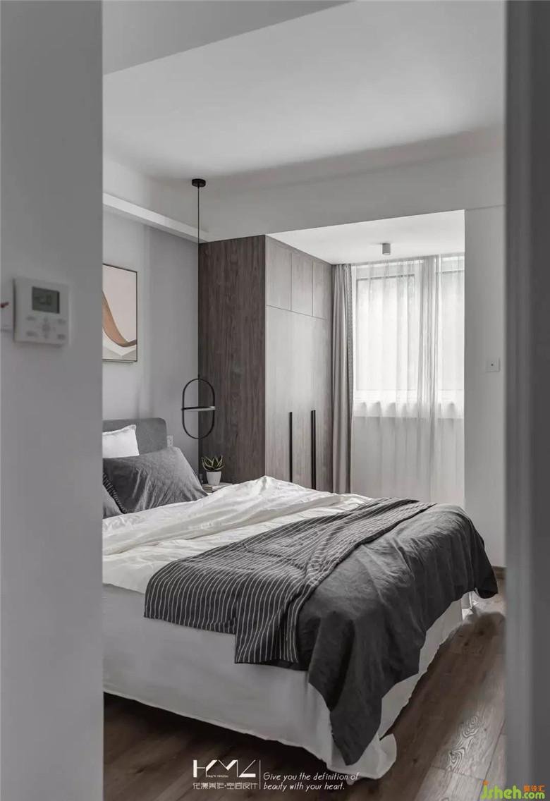 主臥整體格調(diào)偏沉穩(wěn),胡桃木的柜體、深灰色的床體和淺灰色的背景搭配白色的墻面,空間呈現(xiàn)一種簡潔、利落的清爽感,床品和床更是融為一體,素色的紋理更凸現(xiàn)空間的氣質(zhì)。