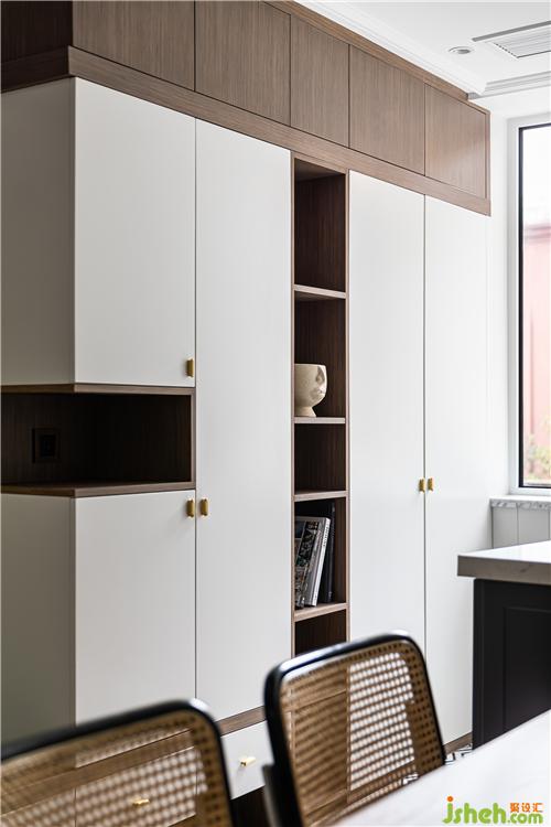 入戶左側(cè)設(shè)計(jì)了整排鞋柜,融合了開架展示與換鞋凳