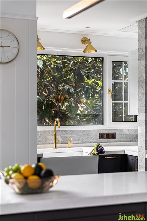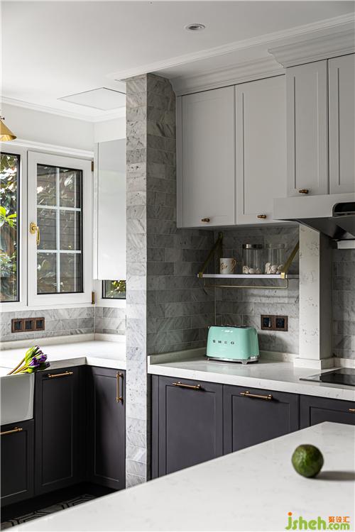 地面采取了六角磚與地板拼接的形式,利于廚房操作空間地面的打理