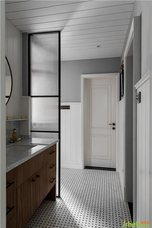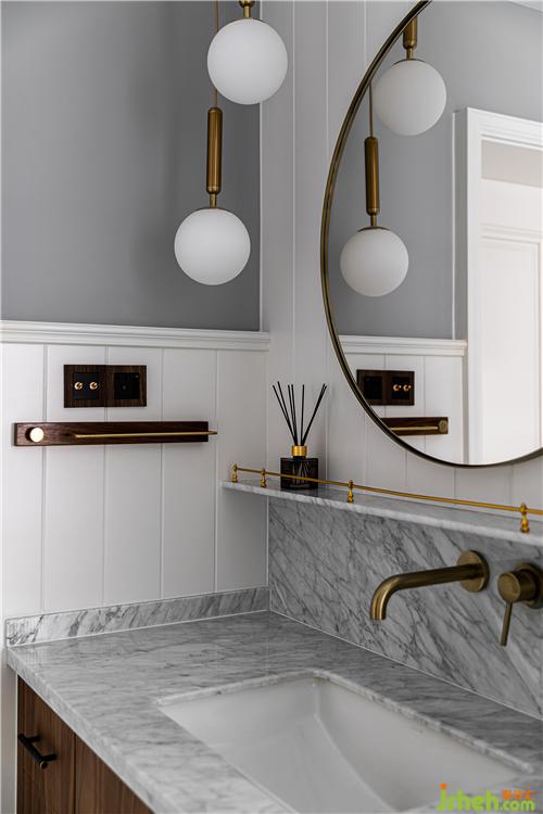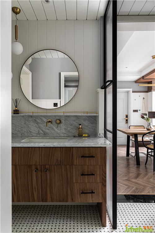 金屬衛(wèi)浴用品與胡桃木色的碰撞使干區(qū)空間盡顯精致