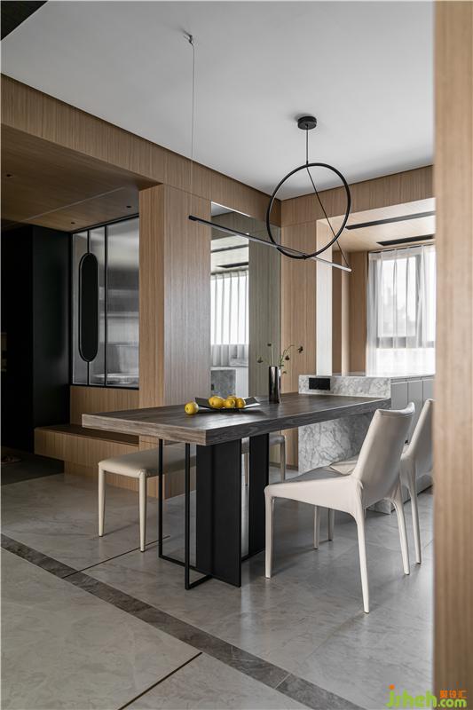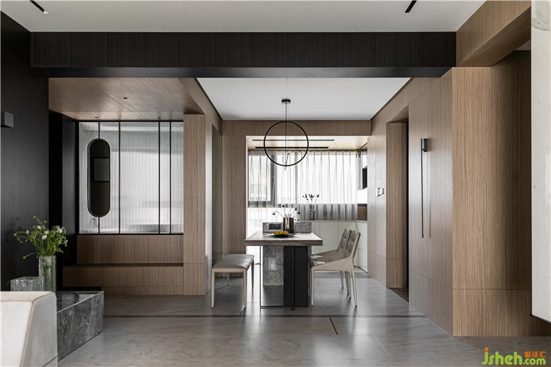 深木飾面包梁,將入戶(hù)與餐廳與過(guò)道三個(gè)區(qū)域進(jìn)行聯(lián)動(dòng),弱化空間邊界感。