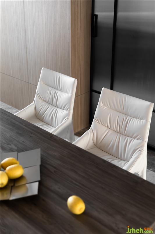 餐桌與島臺(tái)一體順延,高低有致,與吧臺(tái)區(qū)形成圍合聯(lián)動(dòng),擁攬絕佳的視野與采光。
