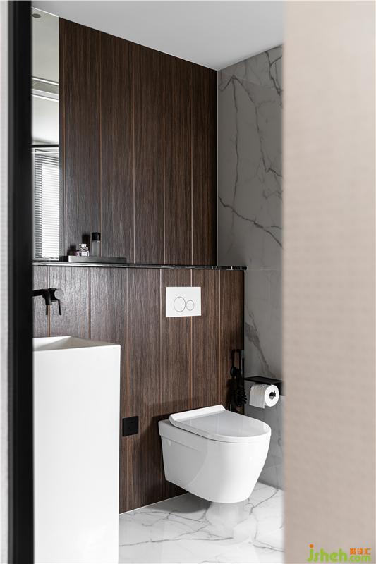 設(shè)計(jì)師同樣注重精準(zhǔn)材料推敲,木紋磚與黑色石材的拼接,立柱盆與墻排馬桶錯(cuò)落布置,無框銀鏡內(nèi)藏了強(qiáng)大的收納功能,門背后預(yù)留了大量的收納區(qū),小空間的立面收納運(yùn)用到極致。