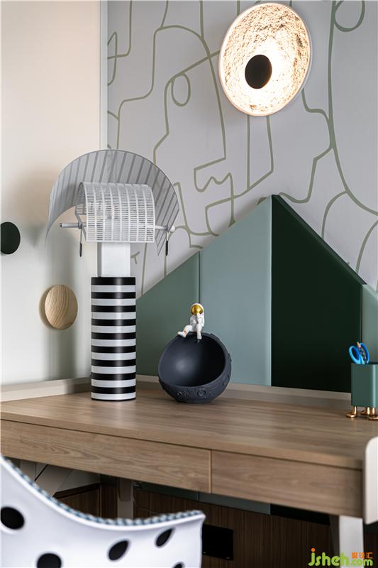 太空人的元素造型巧妙運(yùn)用到擺件,床品,掛飾,燈飾等等……就像是一個(gè)太空樂園,為孩子的成長環(huán)境增貼了不少趣味性。