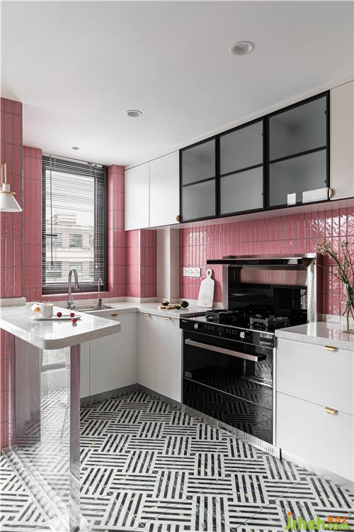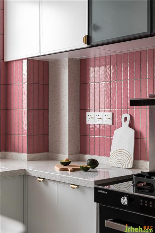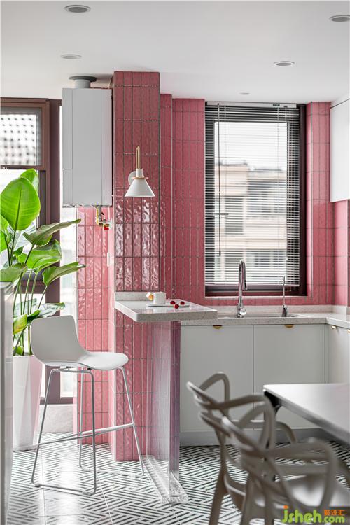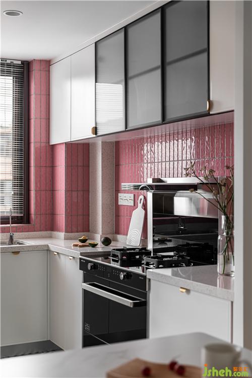 廚房的最大的亮點就是大面積小粉磚的鋪貼,將這個小小的廚房襯的溫馨自然.