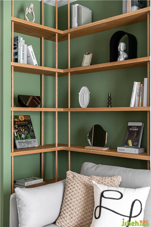 沙發(fā)背后利用空間原始凹陷結(jié)構(gòu),打造一個(gè)開放的陳列區(qū),單獨(dú)跳躍的色彩增加空間的趣味和美觀.