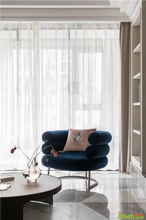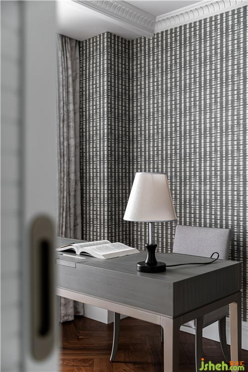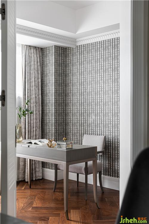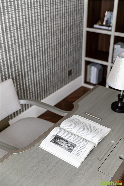 進口斑點圖案壁紙、人字拼地板、陣列排布的書架,呈現(xiàn)出一種秩序之美;書架采用奶油色烤漆封板對胡桃木柜體進行分割, 打破木色的厚重感;窗簾、書桌、書椅以優(yōu)雅的灰色調(diào)為主,營造沉靜復(fù)古的書房氛圍.