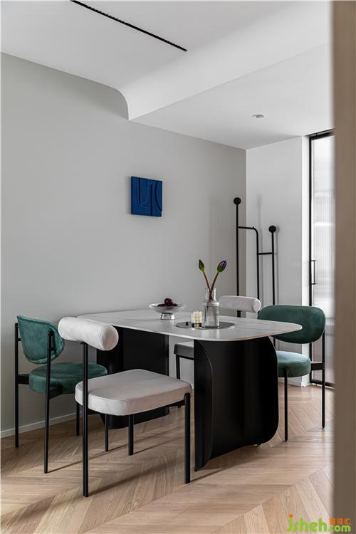 為了弱化建筑結(jié)構(gòu)梁體,吊頂做了弧形處理,增加空間延展性;餐廳位于過(guò)度地帶則沒(méi)有過(guò)多的裝飾,一副藍(lán)色的立體畫(huà)是點(diǎn)睛之筆,在滿足基本就餐需求之余,更多的希望保證這個(gè)空間的互動(dòng)和完整性.