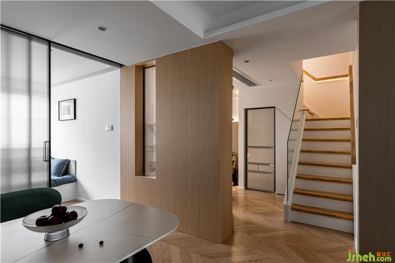 左側(cè)墻面采用鏡面進(jìn)行裝飾反射,并在視覺(jué)上擴(kuò)大玄關(guān)空間.