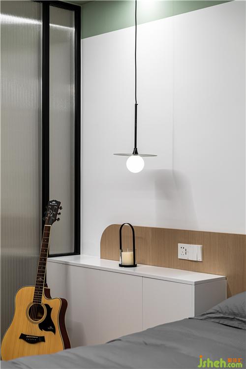極簡圓形床頭邊幾和沉穩(wěn)簡約的藤編隔斷組合,產(chǎn)生了材質(zhì)、色彩與線條的對比,最平常的局部小景因室內(nèi)設(shè)計師混搭手法而變得有質(zhì)感.