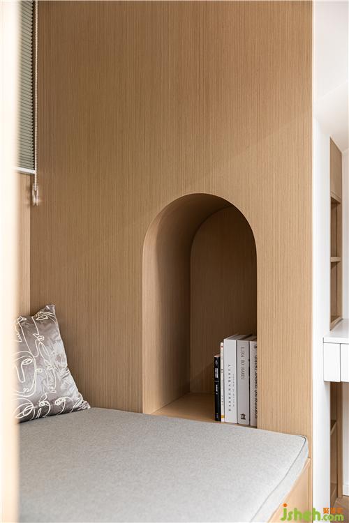飄窗被木飾面柔和的曲線包裹,唯一的窗戶增加了空間的透氣性,弧的運用營造一種材料的美感.