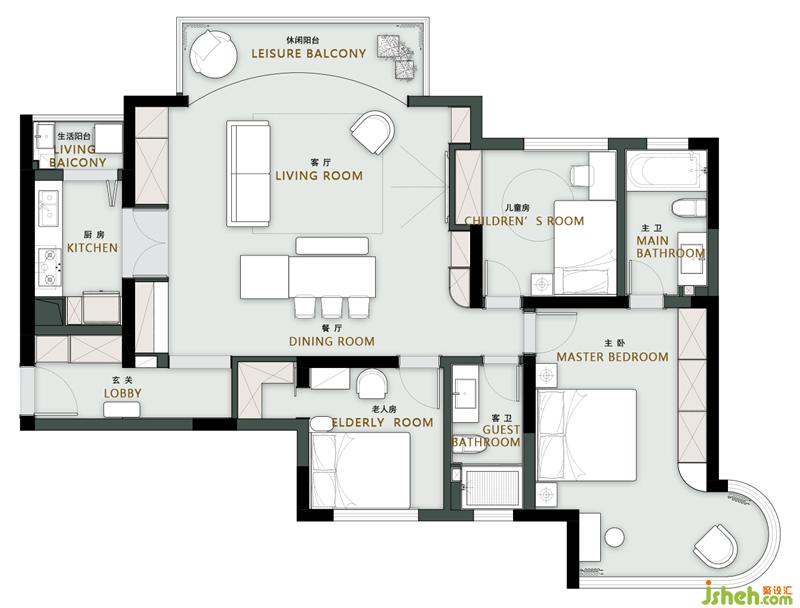 2. 老人房空間較小,利用入戶的過(guò)道空間設(shè)置衣帽間,增加老人房?jī)?chǔ)物的同時(shí),削弱玄關(guān)過(guò)道的狹長(zhǎng)感.