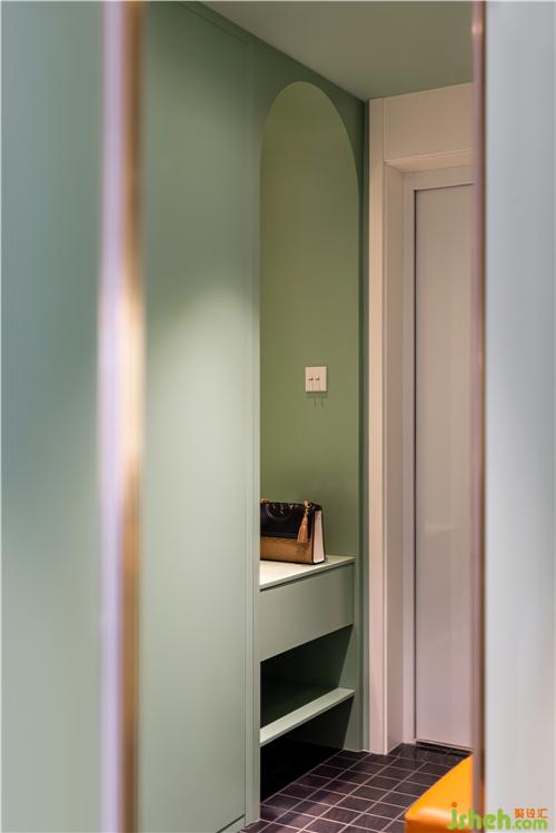 鞋柜綠色烤漆門板,與墻面乳膠漆同色. 鞋柜設(shè)置開放柜,掛衣物包包、存放小物品、臨時(shí)鞋子收納,功能齊全.