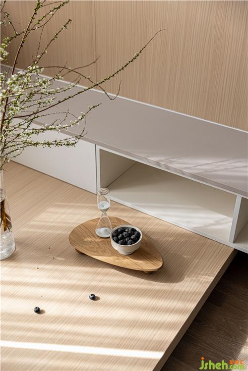定制電視抽屜柜與地臺穿插設(shè)計,打破空間界限,增加層次感.