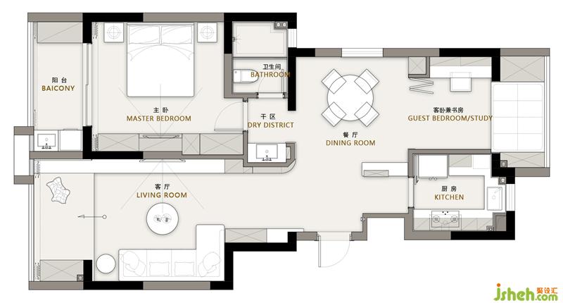 4. 干區(qū)朝向改變,避免主臥房門正對干區(qū)鏡子.