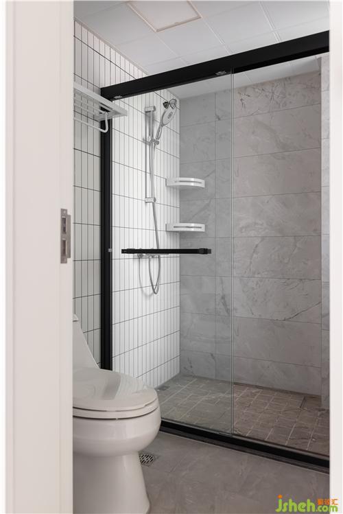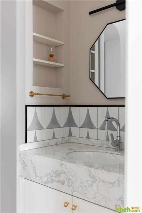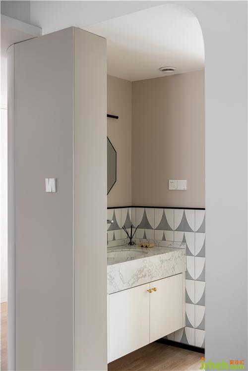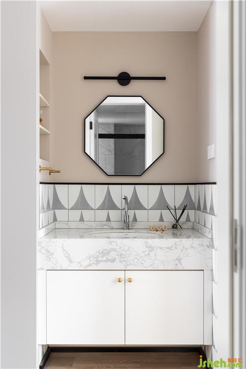干區(qū)半墻幾何手工花磚秩序排布,八邊形黑框銀鏡、極簡(jiǎn)壁燈、黑色金屬線條,理性直線與溫潤(rùn)奶茶色碰撞,靜謐又柔和南京裝修設(shè)計(jì).