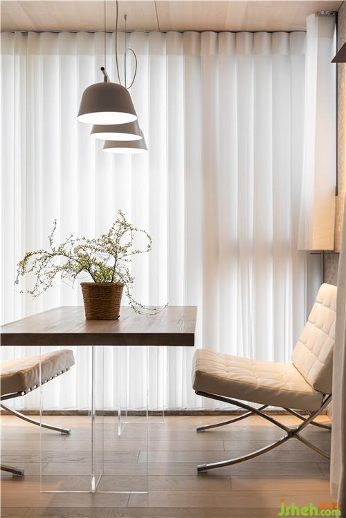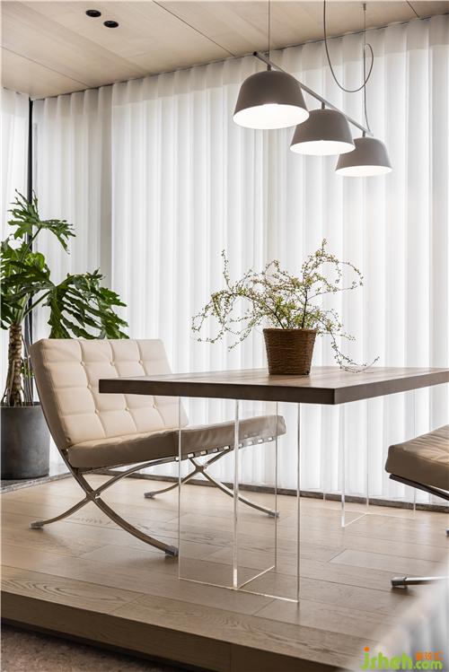 晨曦或午后,光線從白色夢幻簾穿透到室內,暖色木飾面在燈光的映襯下為空間增添溫度,休閑沙發(fā)桌椅組合的配置,豐富了休閑陽臺的功能.