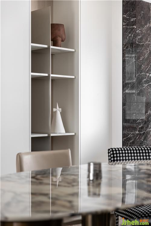 包裹式的處理手法,像一個盒子鏈接了兩個臥室,房門都是隱形處理,沒有多余的包邊、線腳,干凈利落,玄關(guān)的墻頂用一根亮面不銹鋼條貫穿切割,三個白熾球燈靈動有趣.