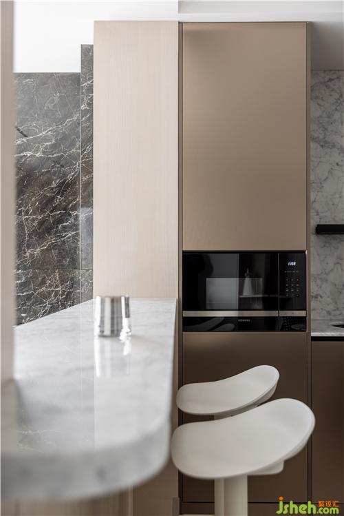 黑色大理石紋理鋪陳打底,開闊的視野窗口,讓光線無限的覆蓋整個廚房空間,亮面烤漆門板簡潔大方,營造整體而統(tǒng)一的視覺性,升降式灶臺很好的解決窗口遮擋問題.