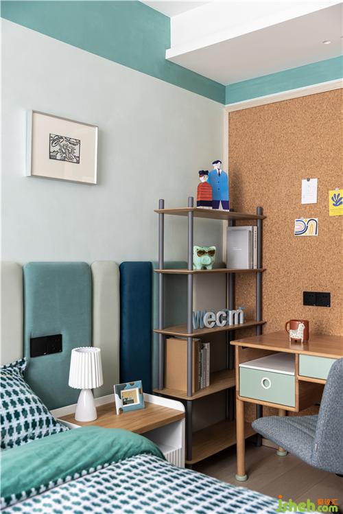 藍(lán)綠色調(diào)是男孩房的主調(diào),三種顏色寬窄不一的床頭軟包有序的排列,布局與女孩房鏡像,泰州裝修設(shè)計(jì)書桌和椅子現(xiàn)代美觀,跟女孩房也是同款不同色,讓姐弟倆的房間有著相同的符號(hào).