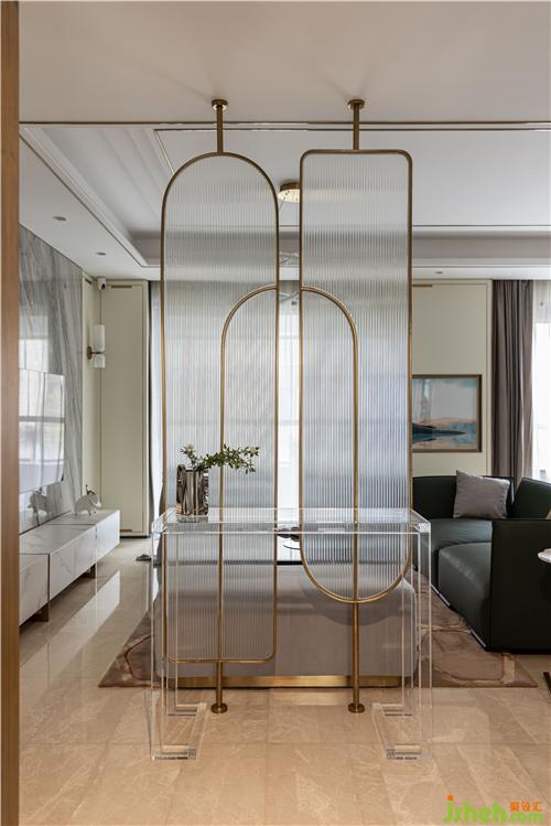 映入眼簾的弧形金屬隔斷,搭配透明的長(zhǎng)虹玻璃,奠定了整個(gè)家溫暖精致的基調(diào). 透明的亞克力玄關(guān)桌通透又有儀式感,入戶的美可以消除一天的疲憊.