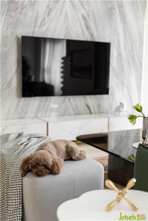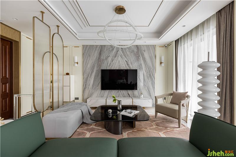 客餐廳是一個(gè)整體的橫廳空間,客廳區(qū)域的電視背景用石材代替原來(lái)的柵格設(shè)計(jì),與金屬走邊的護(hù)墻拼接來(lái)彰顯空間的層次感. V型的石材紋理也更具沖擊力,南京室內(nèi)設(shè)計(jì)師吸引眼球. 墨綠色的沙發(fā)搭配黑色玻璃茶幾沉穩(wěn)大氣,中和空間的清冷氣質(zhì),達(dá)到審美平衡.