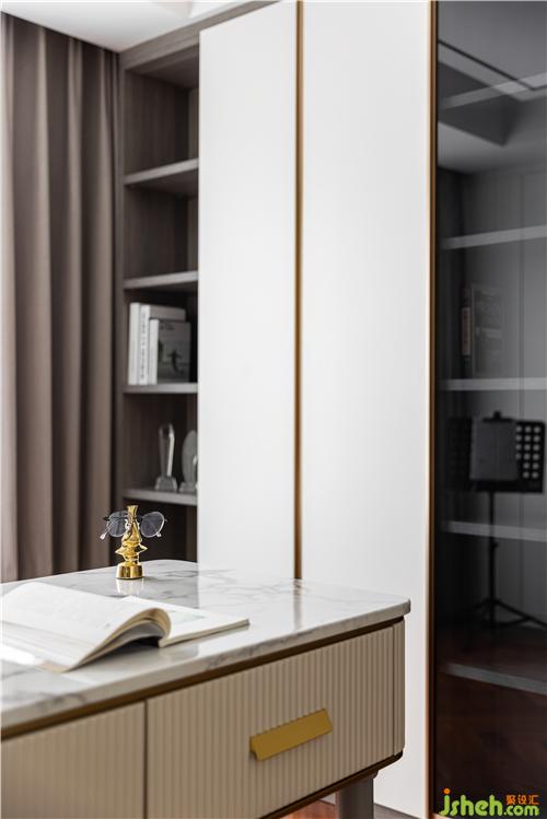 石材面的書桌彰顯肌理感,墻上個性的立體裝飾畫打破壁紙的單一性,沒有特別跳躍突出的元素,但卻處處充盈著恬靜氣息. 書柜則是實用性的體現(xiàn),收納美觀,一氣呵成.