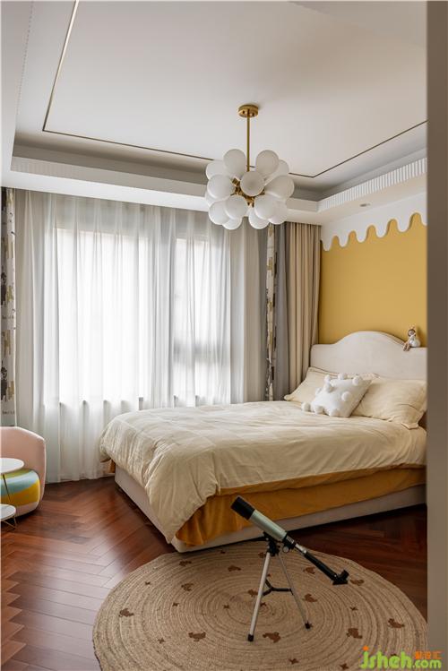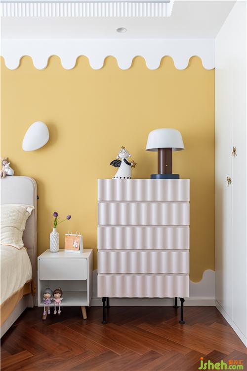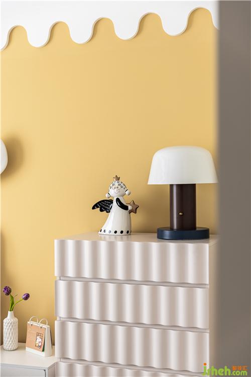 空間整體通透明亮,明黃色乳膠漆搭配白色波浪形墻面裝飾賦予空間溫暖、俏皮的氛圍感. 大面積簡潔的灰白色調(diào),點綴高飽和度家具,讓空間生動起來.