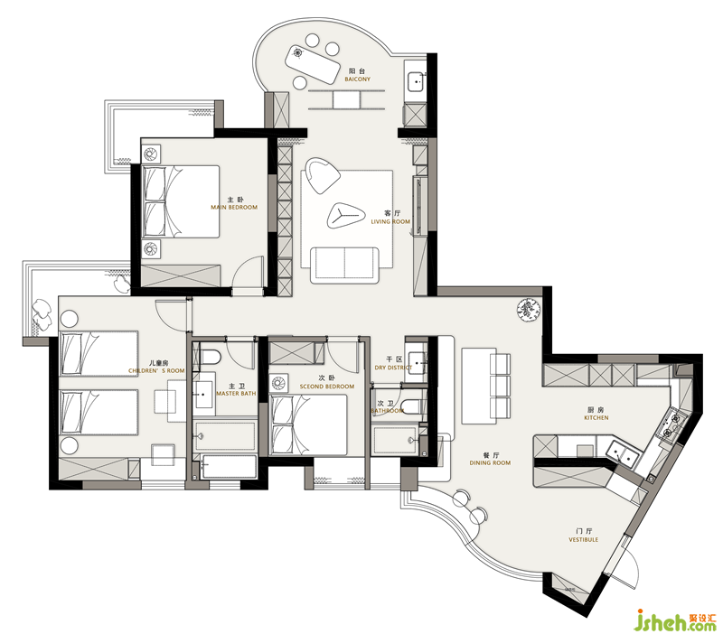 4、兒童房房門內(nèi)退,取消套衛(wèi),設(shè)置獨(dú)立主衛(wèi),放置浴缸