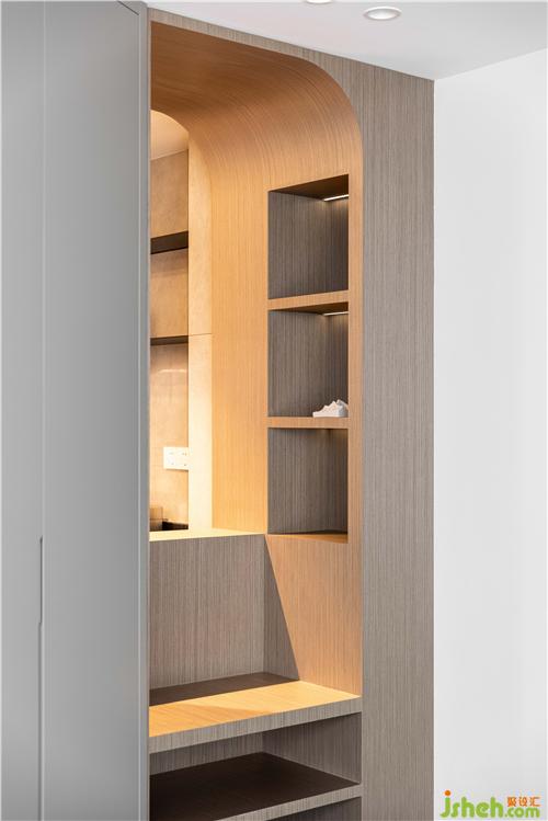 整面儲(chǔ)物柜為門廳預(yù)留出足夠的儲(chǔ)物空間,理性線條與弧形曲面碰撞的造型卡座,靜謐沉穩(wěn),與其背后一幾窗洞內(nèi)的煙火氣形成鮮明對(duì)比,增加了空間的趣味性與互動(dòng)感.