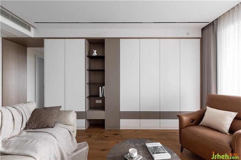 2、客廳兩側(cè)設(shè)置儲(chǔ)物柜,內(nèi)嵌電視機(jī),滿足儲(chǔ)物需求
