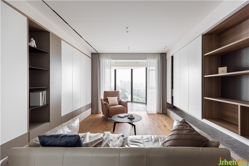 推門入戶,干凈的灰白色調(diào)營(yíng)造出恬淡靜雅的氛圍,現(xiàn)代的線條勾勒出藝術(shù)情調(diào),空間中加入原木元素,多了份溫暖和舒適,輕盈的薄紗將光線引入,呈現(xiàn)出輕松舒適的氛圍.