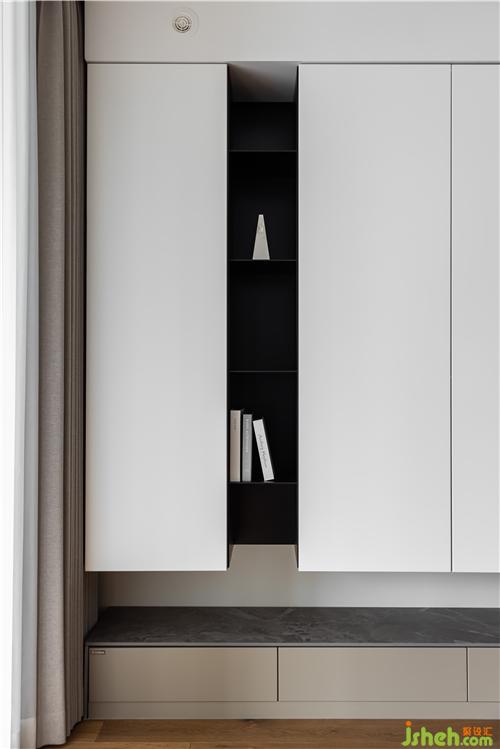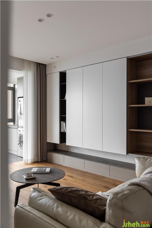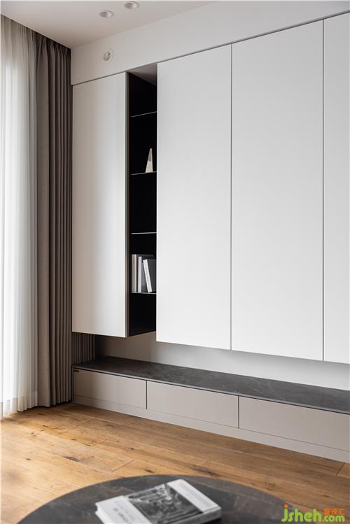 懸浮巴士柜門,把電視機內(nèi)嵌其中,觀影模式與閱讀模式隨意切換,呈現(xiàn)出多樣的家庭場景.