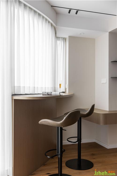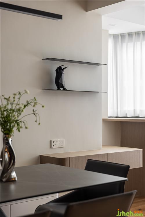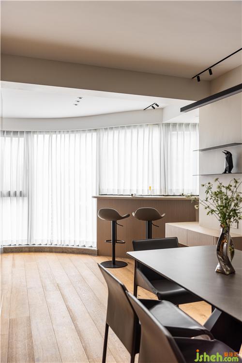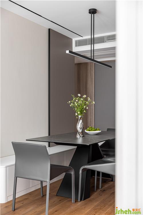 開放式廚房,打通傳統(tǒng)廚房與餐廳空間的隔閡,讓空間更具延伸感,灶臺(tái)與水池遠(yuǎn)離客餐廳區(qū)域,避免了油煙對(duì)客餐廳的影響.