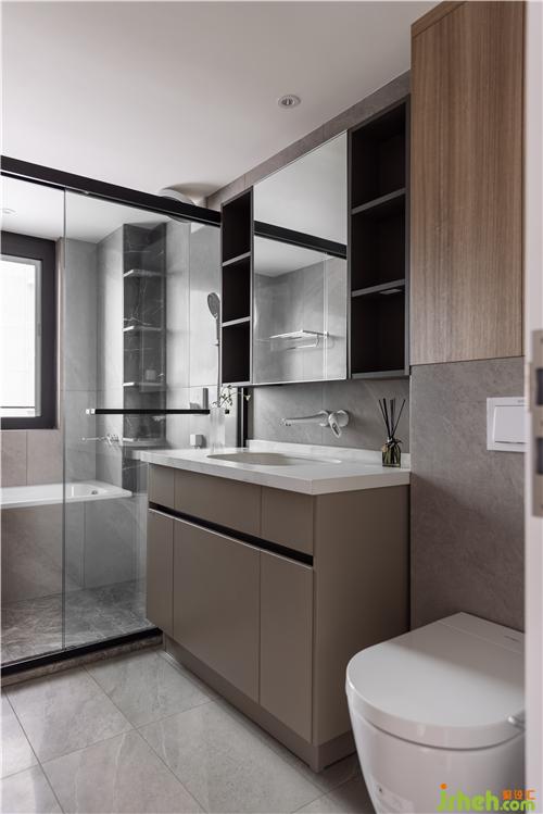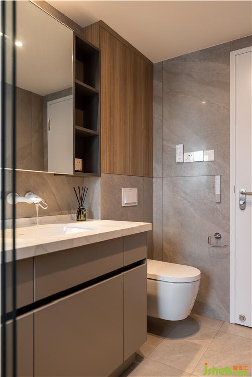 主衛(wèi)打破傳統(tǒng)布置方式,臺盆內置,如廁區(qū)與淋浴區(qū)分開,避免細菌滋生. 鏡柜結合開放架形式,方便日常洗漱用品放置,同時利用壁掛馬桶的墻體構造,增加儲物空間.