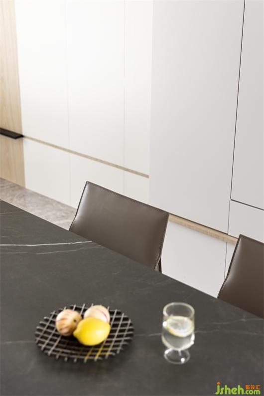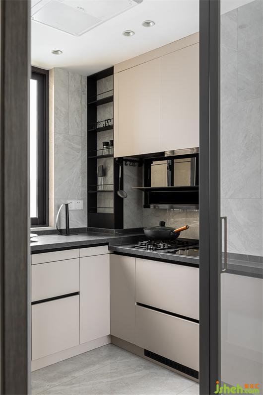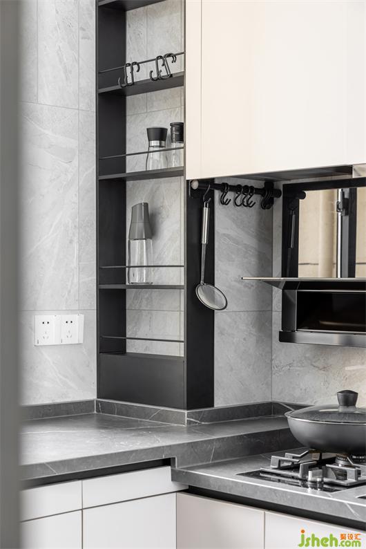 廚房設(shè)置高低臺面,符合人體工學(xué),炒菜洗菜更加輕松. 定制鋼板置物架,釋放臺面空間,干凈整潔.