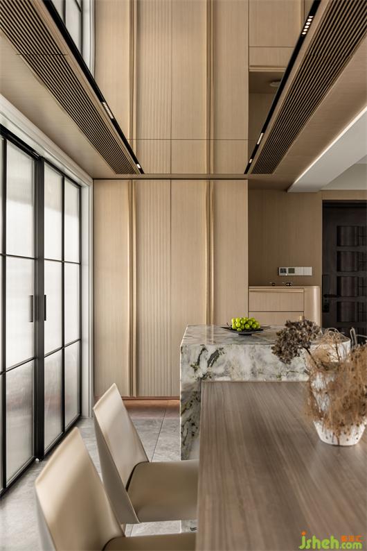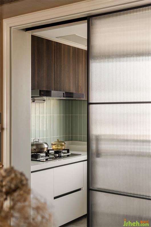 花漾美作尤加利煙熏木飾面吊柜與淺綠玻璃磚的搭配,讓廚房這個角落倍感愉悅輕松。