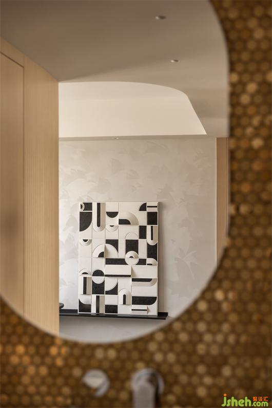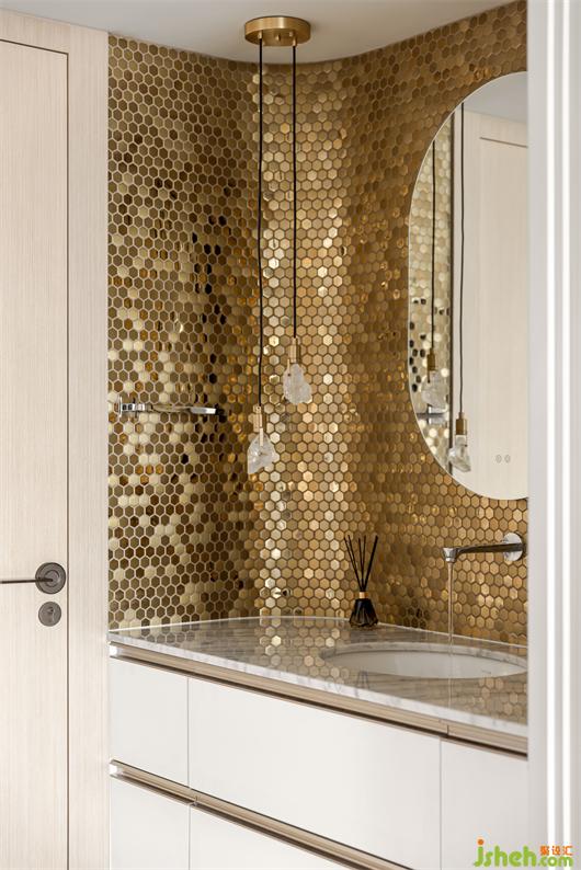 金色馬賽克的整面內(nèi)弧形背景墻與圓弧發(fā)光鏡的融合,將肌理、燈光、質(zhì)感等元素融合在一起,花漾美作營(yíng)造出精致到恰到好處的氛圍感空間。