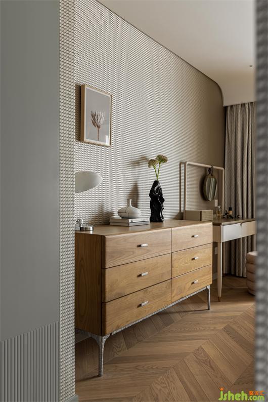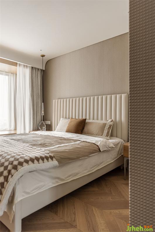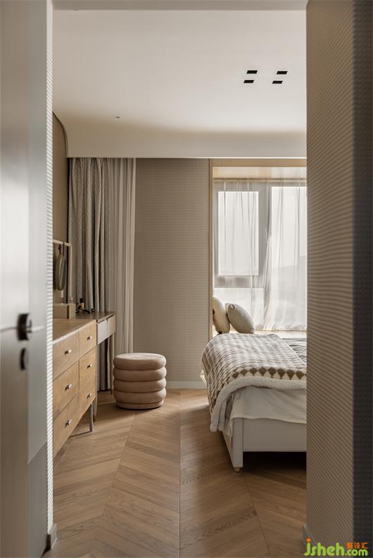 主臥選用最暖人心脾的大地色系進(jìn)行搭配設(shè)計(jì),肌理感的墻布,溫潤(rùn)木色系的家具,花漾美作在溫柔色調(diào)的濾鏡下,讓空間展現(xiàn)出溫潤(rùn)寧?kù)o,歲月靜好的模樣。白色皮質(zhì)床背靠,晶瑩剔透的燈具和柔和的紗幔窗簾結(jié)合將質(zhì)樸的寧?kù)o與時(shí)間消逝的美留存于空間,通過(guò)設(shè)計(jì)營(yíng)造舒適安心的自然氛圍。