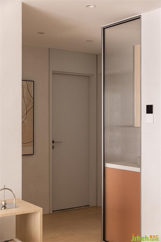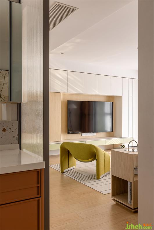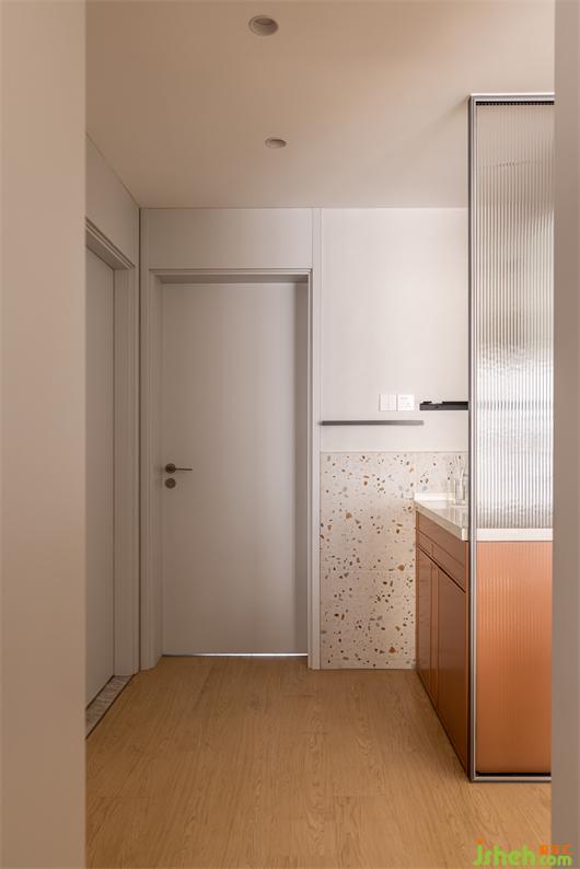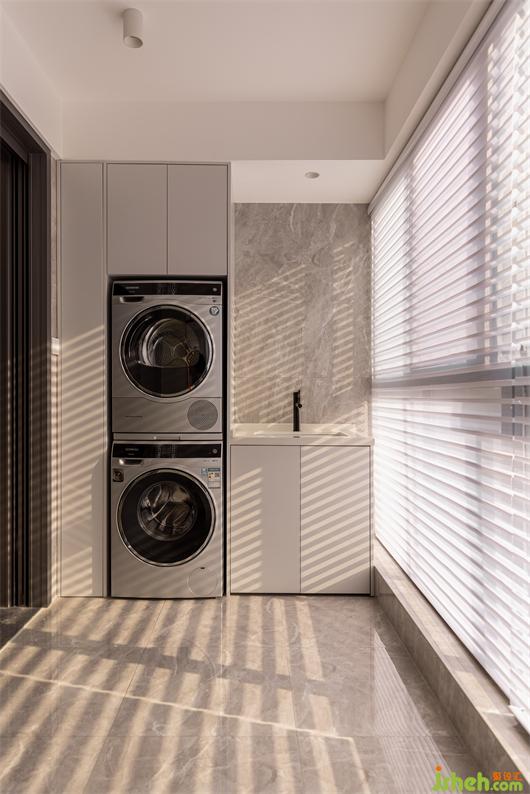 灰色系石紋大磚通鋪,簡潔大氣。同色系收納柜搭配相得益彰,陽光穿透百葉簾,灑在地面,描繪溫暖的生活場景。