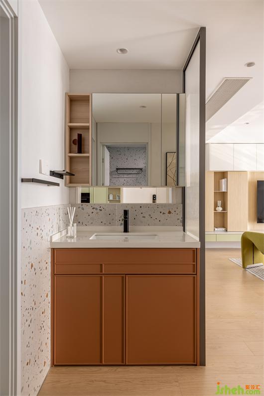 重新定義衛(wèi)生間功能用途,在基礎(chǔ)的干濕分區(qū)之上,別出心裁加入一面長虹玻璃隔斷。從造型上豐富了客廳的裝飾元素,在功能上,讓原本無自然采光的干區(qū)變得通透,為空間注入全新的材質(zhì)結(jié)構(gòu)。