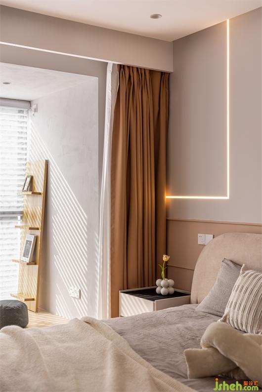 南京家裝設(shè)計(jì)背景墻分色處理,暖灰和粉橙色碰撞。利落的線性燈與簡約的石膏線條通過縱橫交錯(cuò)的重疊手法進(jìn)行演繹,提升格調(diào)展現(xiàn)氣質(zhì)的同時(shí)在視覺上形成錯(cuò)位感,空間顯得更加輕盈。衣柜轉(zhuǎn)角處的風(fēng)格延伸更是增加了空間的整體性。
