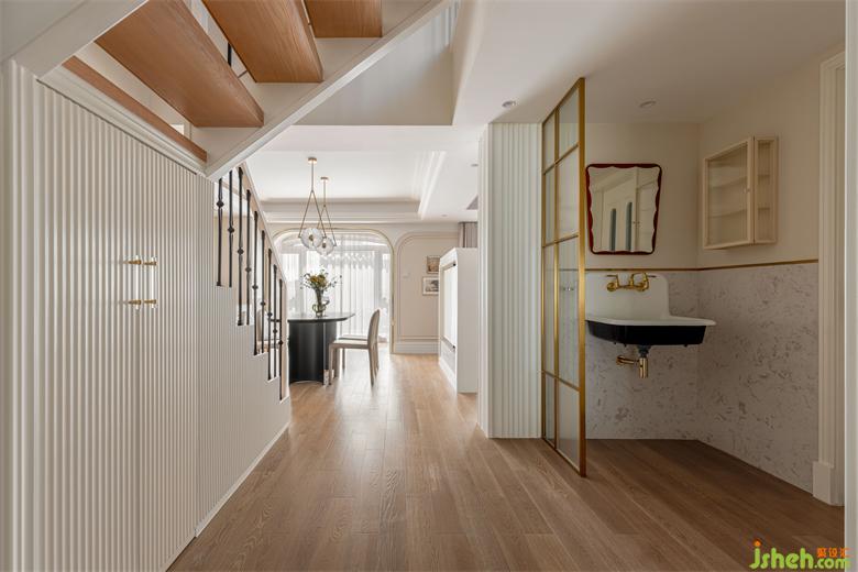 入戶空間沒有玄關(guān)過渡,有種局促感,為了弱化這種感覺,我們將客臥墻體和干區(qū)整體后退,擴大門廳和過廳區(qū)域,鞋柜與樓梯下方收納做結(jié)合,樓梯上樓方向設置在餐廳這側(cè),讓門廳與過廳整體充分寬敞,客臥門自然就成了“玄關(guān)背景”,花漾美作設計了一款特別款式的房門,作為玄關(guān)背景.入戶右手邊設置了櫻桃木的全身鏡和銅質(zhì)壁燈,為入戶增添了復古氛圍。