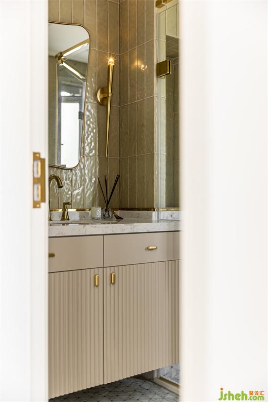 主衛(wèi)用卡其色作為主色,墻面跟客衛(wèi)一樣,也采取上下分割的方式,下墻裙與地面用同款馬賽克材質(zhì)整鋪,花漾美作讓空間有種包裹感,上圈用卡其色通透的玻璃磚豎鋪,拉高層高視覺感的同時(shí)為空間增加了靈動(dòng)的美感,金色花灑、金色壁燈、金色銅鏡讓整個(gè)空間精致復(fù)古味十足!