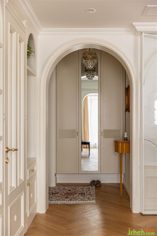 入戶正對的是法國畫家布格羅的女孩肖像油畫,做舊畫框與下方姜黃色的Zanotta單腿柜相呼應(yīng),南京裝修設(shè)計公司緊抓視線焦點,給人奇妙的感官體驗。法式拱門的優(yōu)雅弧線將一絲靈動帶入這個方正空間,也為步入客餐廳空間增加了儀式感。